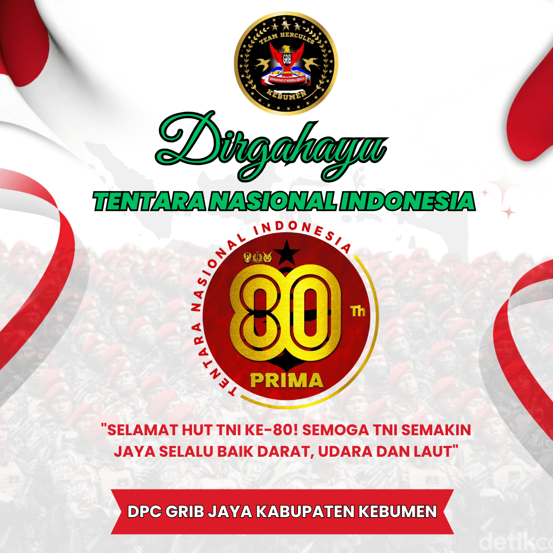 “Saya mewakili Keluarga Besar Dpc Grib Jaya Kabupaten Kebumen, mengucapkan Dirgahayu Tentara Nasional Indonesia Ke 80 tahun. Dengan semangat Tri Dharma Eka Karma, semoga TNI Prima, TNI Rakyat, TNI semakin jaya, di darat, di udara dan di laut” ucap Ketua Dpc Grib Jaya Kabupaten Kebumen.