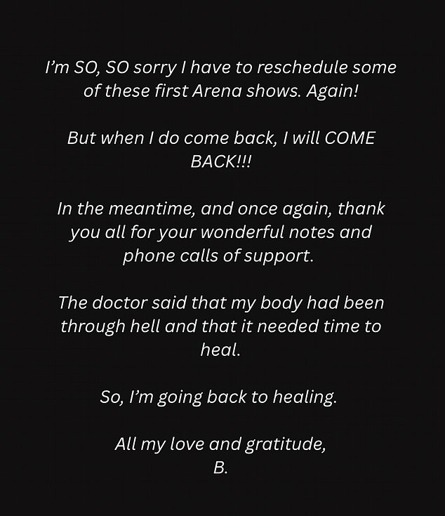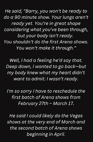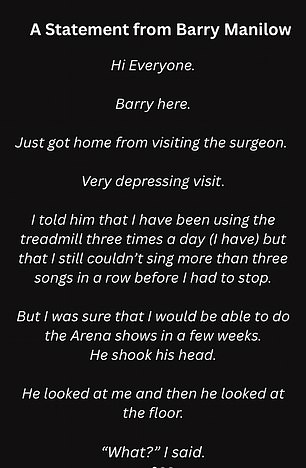 “In the meantime and once again, thank you for all your wonderful notes and phone calls of support,” Manilow wrote, acknowledging the outpouring of well wishes from his fans. He candidly admitted that his body has “been through hell” and requires “time to heal.”