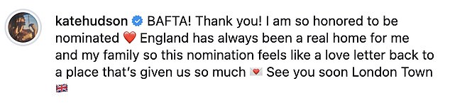 In her accompanying caption, Hudson conveyed her deep appreciation to BAFTA, describing the nomination as feeling “like a love letter.” She elaborated on this sentiment, explaining that England has always held a special place in her heart and that of her family, viewing it as a “real home.”