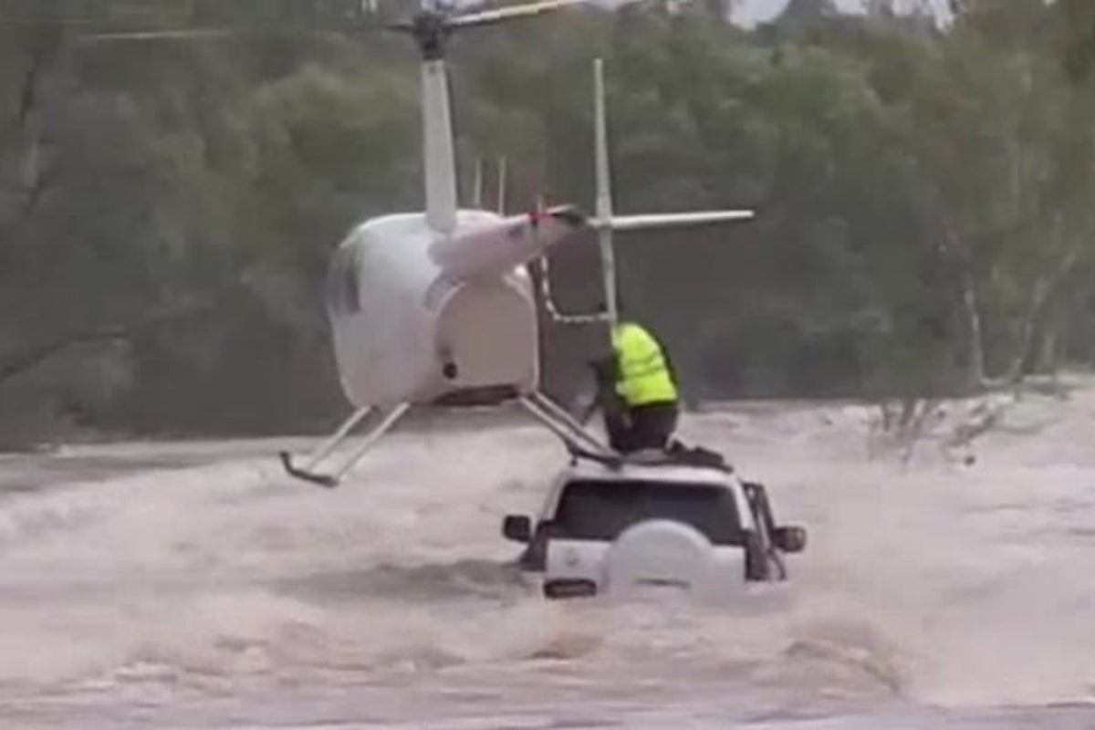 The incident occurred at a creek crossing, where a car found itself trapped by the unexpectedly powerful flow of water. With the situation escalating rapidly, a passing helicopter pilot played a crucial role in the rescue operation. Demonstrating incredible skill and presence of mind, the pilot ferried a police officer to the roof of the stranded vehicle.