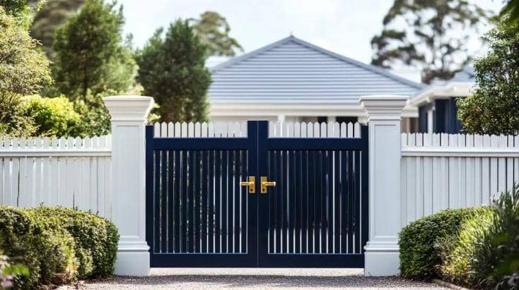 Perpaduan biru dongker dan putih adalah salah satu pilihan paling populer untuk rumah bergaya modern. Warna biru dongker yang pekat memberikan kesan kuat dan elegan, sementara warna putih hadir sebagai penyeimbang yang membuat tampilan pagar terlihat bersih, rapi, dan lapang.