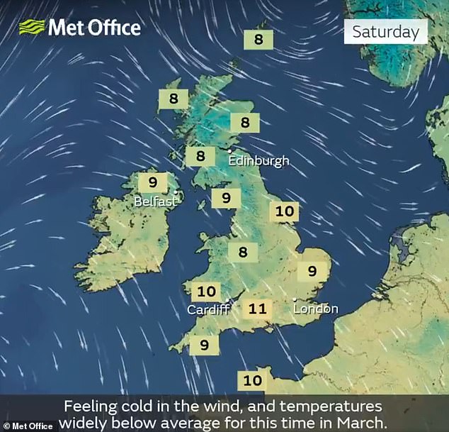 - Saturday: Expect a mix of sunny spells and showers, some of which could be heavy and wintry, featuring hail, snow on higher ground, and isolated thunderstorms. More persistent showers are anticipated for some regions later in the day. The wind is expected to be blustery, making it feel colder than the preceding day.