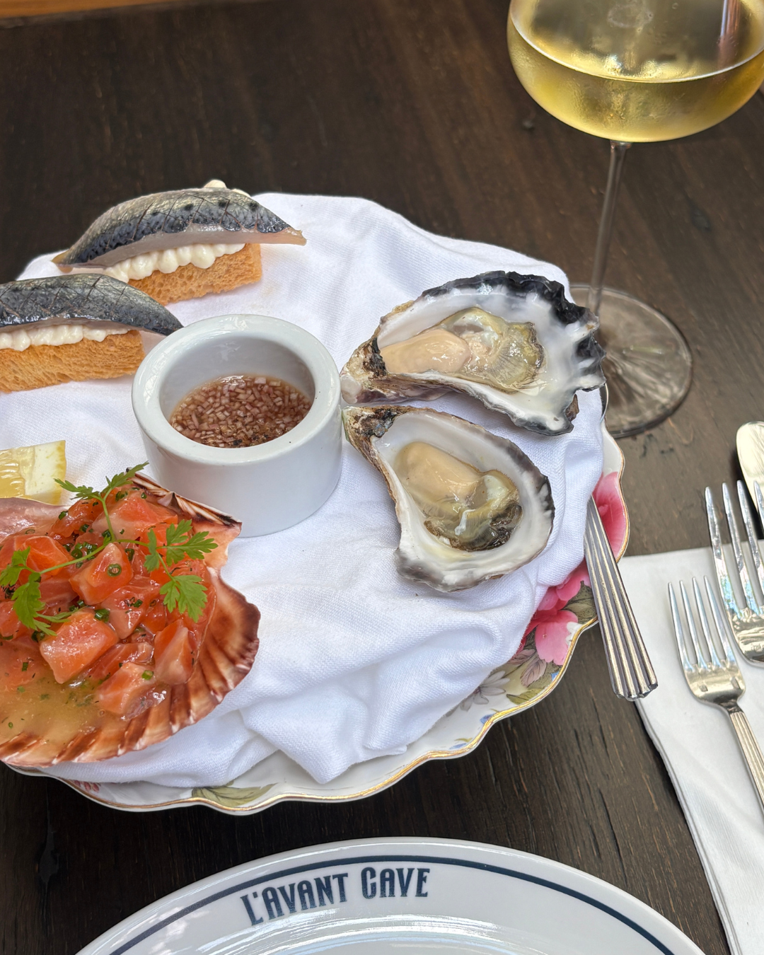 L’Avant Cave, now under the direction of Nik Hill (Chef of the Year for 2025), has transformed into a relaxed wine and snack destination. While it no longer functions as a wine shop, the charm of the courtyard and the strong wine selection remain. The snack menu includes baked oysters, pigeon liver toasts, and daily seafood snacks priced at $12 each for guests to create their own platter.