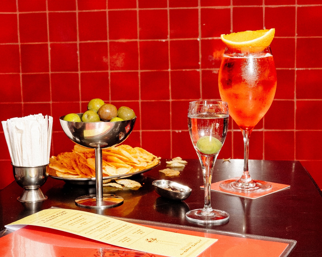The signature cocktail combines gin, orange liqueur, and Campari for a citrusy and slightly bitter finish.