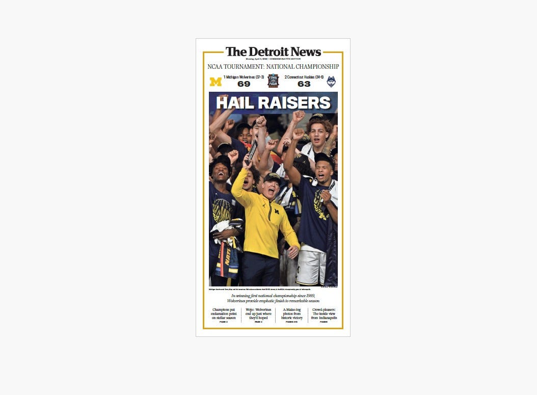 - An eight-page section of season highlights, which chronicles the Wolverines’ road to the championship. This section will be included in The Detroit News of Friday, April 10, but will be reprinted on heavier stock to preserve the memories.