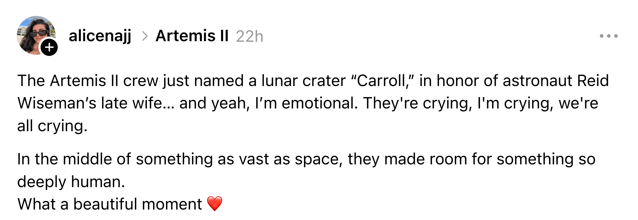 “It’s a bright spot on the moon, and we would like to call it Carroll,” Hansen said during the broadcast. Wiseman could be seen wiping away tears as the tribute unfolded, showcasing the emotional weight of the moment.