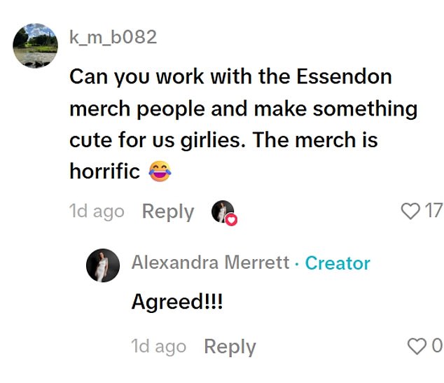 One follower asked, “What’s the point of doing this if you leave by half time?” referring to her visit to Gimlet. Another user shared a doctored image of Alexandra wearing a Hawthorn guernsey, a nod to her husband’s failed move to the Hawks. Despite the criticism, she did not respond to most of the comments, except for one that suggested working with Essendon’s merchandise team to create something more appealing.