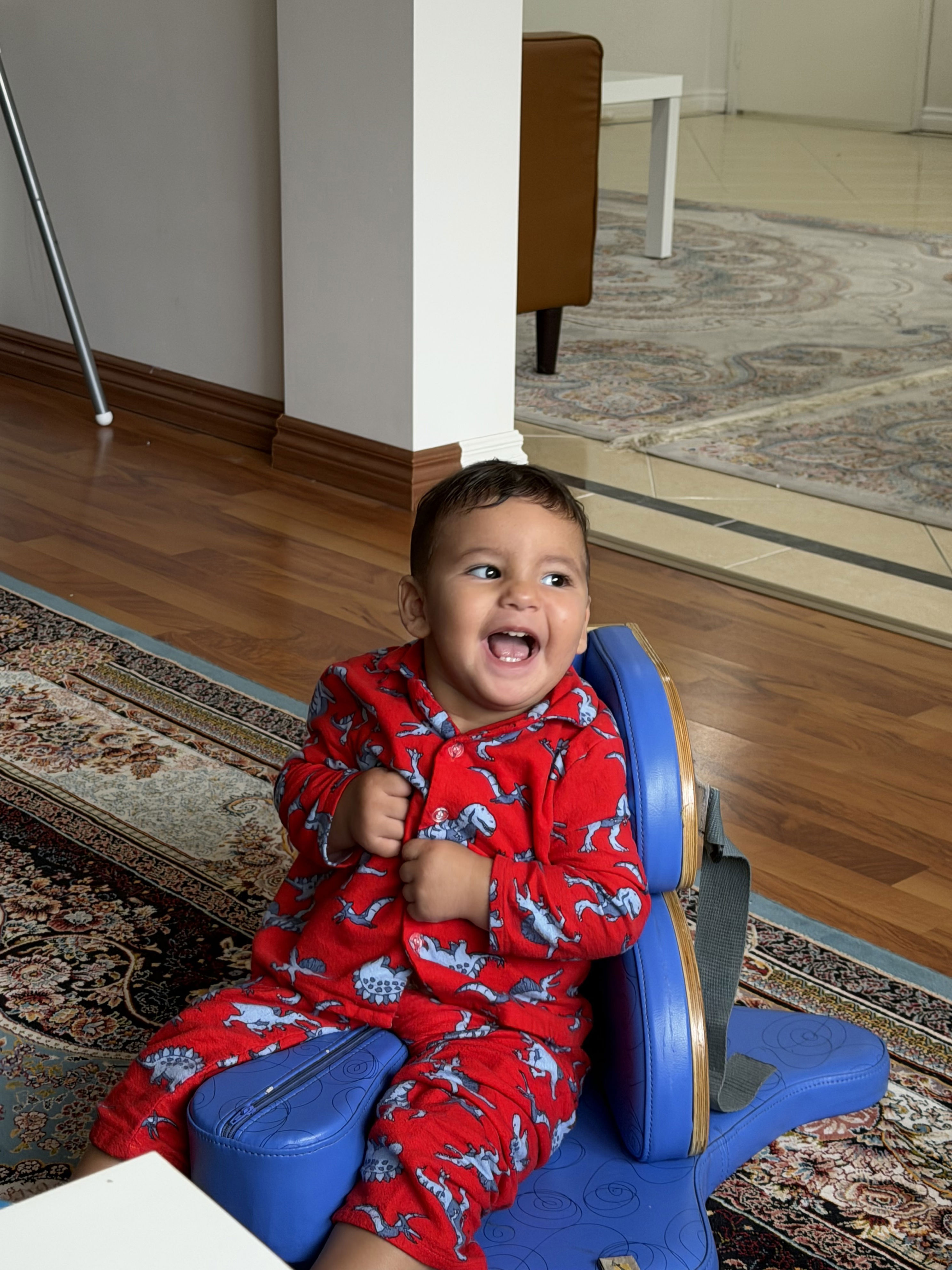 Ali Hadi is now 16 months old, and isn’t able to roll, crawl, or walk without support and he struggles with speech. “I feel like he communicates in his own ways,” Farah says. “His main problem is that he cannot move his arms. He’s so tight in his arms, so he can’t practically reach out, and his legs are also quite tight.”