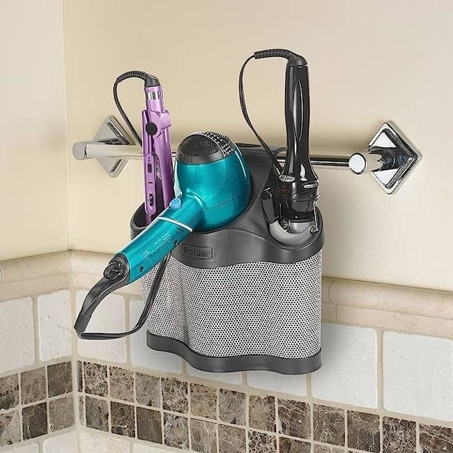 A styling tools station so your hair dryer, curling iron, and hair straightener don’t take over the very limited counter space in your bathroom (cuz it looks like you’re also using your sink as storage space 😬). It’s made with a heat-resistant mesh that allows for airflow, so your hot tools can cool down safely. There’s also space in the back to help keep the cords from getting tangled.