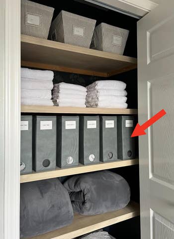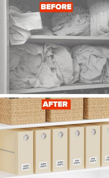 A set of foldable bedsheet organizers so that when you open your linen closet, you’re not welcomed by a toppling mass of tangled sheets. Each organizer has a little window and label cards so you can even see which sheet set is inside.
