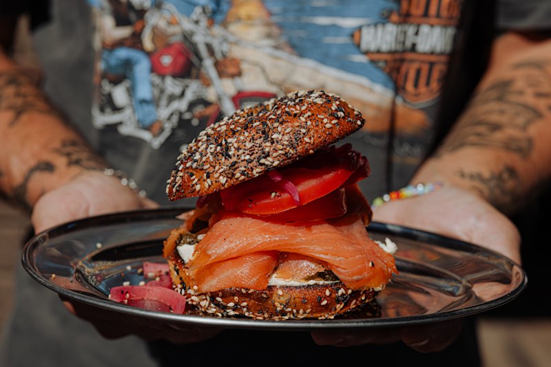 Take the salmon bagel: a hand-shaped ring of fluffy, long-fermented dough, wrapped in white paper and cut precisely down the middle. Pull it apart, and you’re met with a cross-section lush with layers of pink pickled onions, tomatoes, slices of cured wild-caught Alaskan salmon and a thick schmear of Neufchatel cream cheese with fried capers.