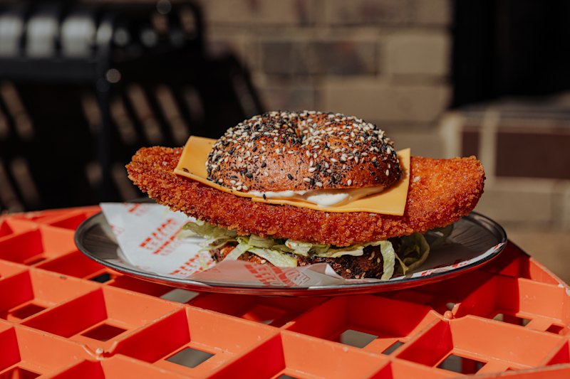 The crumbed chicken is huge, extending far beyond the bounds of the bagel’s golden crust, and paired with lettuce, American cheese, cowboy butter and pepper mayo. Have it with a side of fermented chilli.