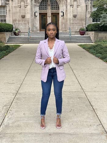 “I bought this blazer in many different colors and have gotten so many compliments. I have traveled all day in them and packed them in a suitcase and haven’t had any issues with them wrinkling. I have owned them for a couple of years now, and they still look as good as the day I bought them. I highly recommend the pink and green blazer.” — Chelsea