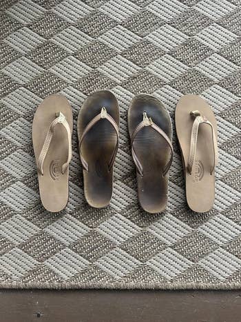 “As lightweight as they feel, you would think they wouldn’t last, but these flip-flops are great! They conform to the sole of your foot and get really comfy! I am on my third pair. The pair pictured in the center is about four years old, and I wear them daily. They are still functioning, but I figured I would get a new pair to start breaking them in. Rainbow girly for life! :)” — Katie