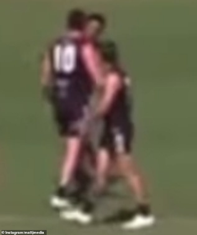 “That’s Jake Carlisle… and this was their first game (Moama) with him being a player and co-coach. He’s decided to smack his own teammate in the face. What’s he doing? This is a disgrace. Even the other teammates, they’re like, ‘What are you doing, mate?’ Echuca United players, they are in disbelief.”