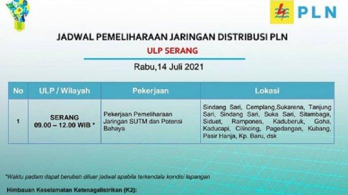 Pemeliharaan jaringan listrik akan dilakukan di sebagian wilayah Kabupaten dan Kota Serang, Provinsi Banten. Kegiatan ini akan berlangsung hari ini, Senin (13/4/2026), mulai pukul 09.00 hingga 16.00 WIB. Masyarakat yang tinggal di Kota Serang khususnya perlu memperhatikan lokasi pemeliharaan tersebut agar dapat menyiapkan diri menghadapi kemungkinan gangguan pasokan listrik.