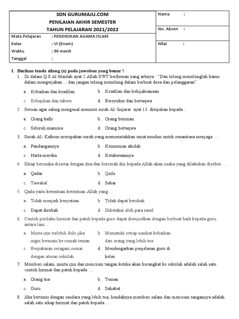 Berikut adalah soal dan jawaban latihan TKA PAI Kelas 6 SD Semester 2 Tahun 2026: