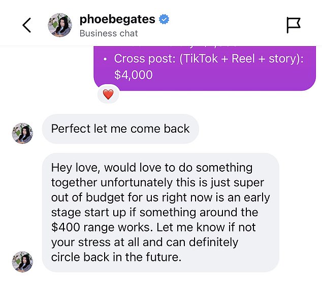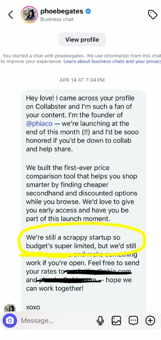Similarly, influencer Raquel Debono recently went viral when she shared a screenshot of her direct message with Phoebe, in which the founder offered a significantly lower rate than what Debono requested.