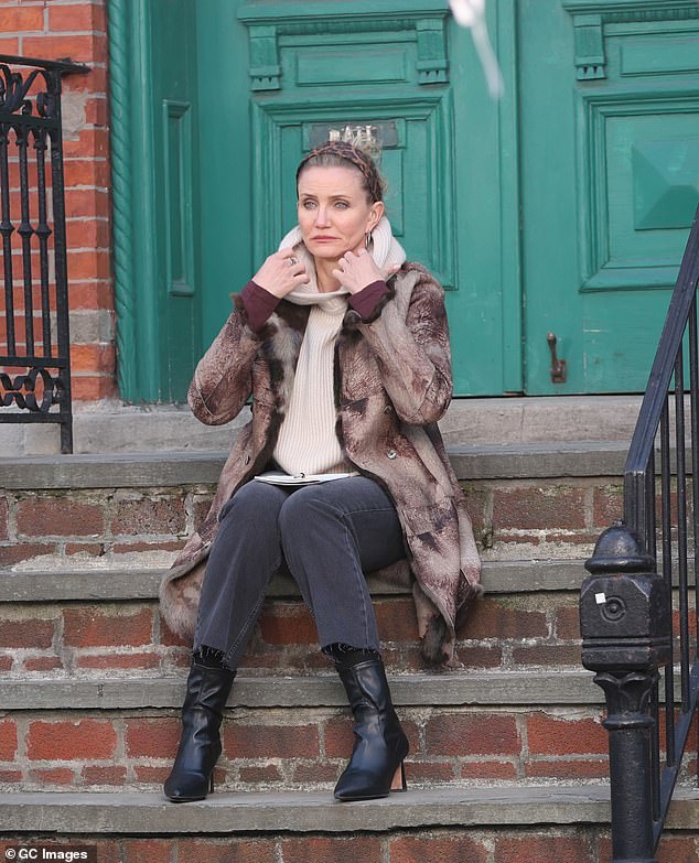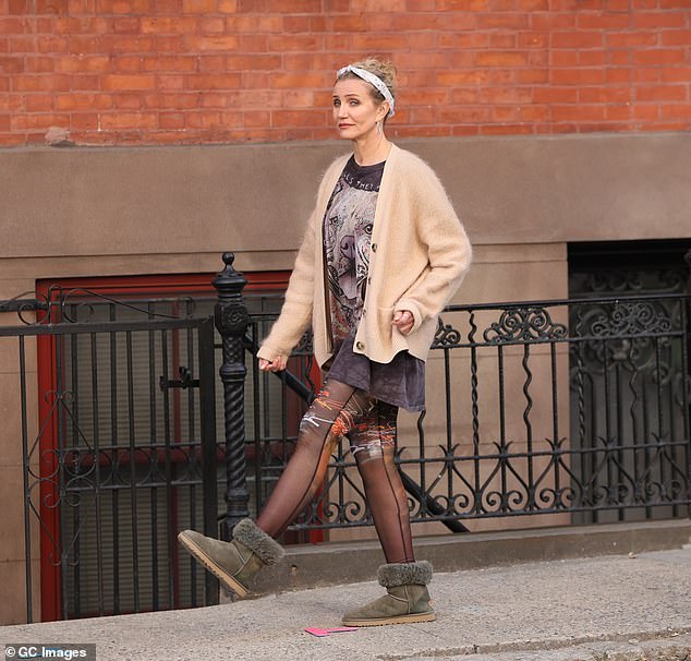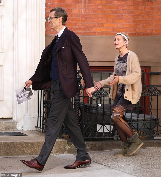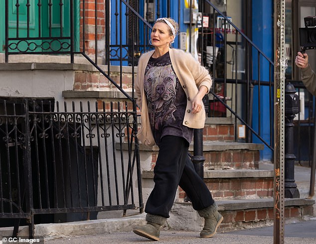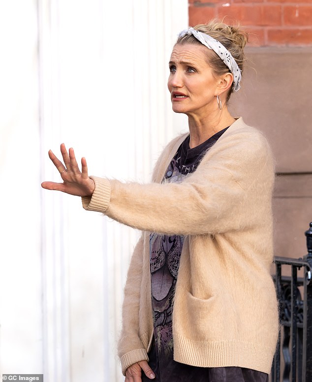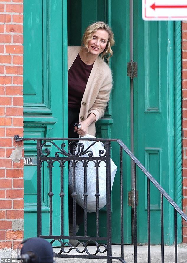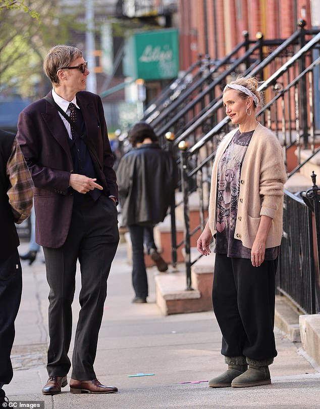 Stephen Merchant, 51, cut a smart figure in a burgundy blazer paired with a navy waistcoat and grey trousers. He strode ahead of Diaz along the sidewalk during the scene. Later in the day, Diaz switched into a cream knit hoodie and grey jeans while relaxing on a set of stairs with her lines in hand. She later changed once again, opting for a burgundy top and the same beige cardigan while filming a scene in which she took out the trash from her apartment.