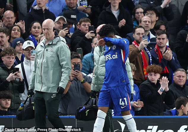 ‘He was devastated,’ said Rosenior. ‘He was crying at half-time. I’m really devastated for him. It looks like it’s his hamstring, and that’s a moment actually when he’s running through on their goal for a one-versus-one and pulls his hamstring in that moment. I hope Estevao comes back sooner rather than later.’