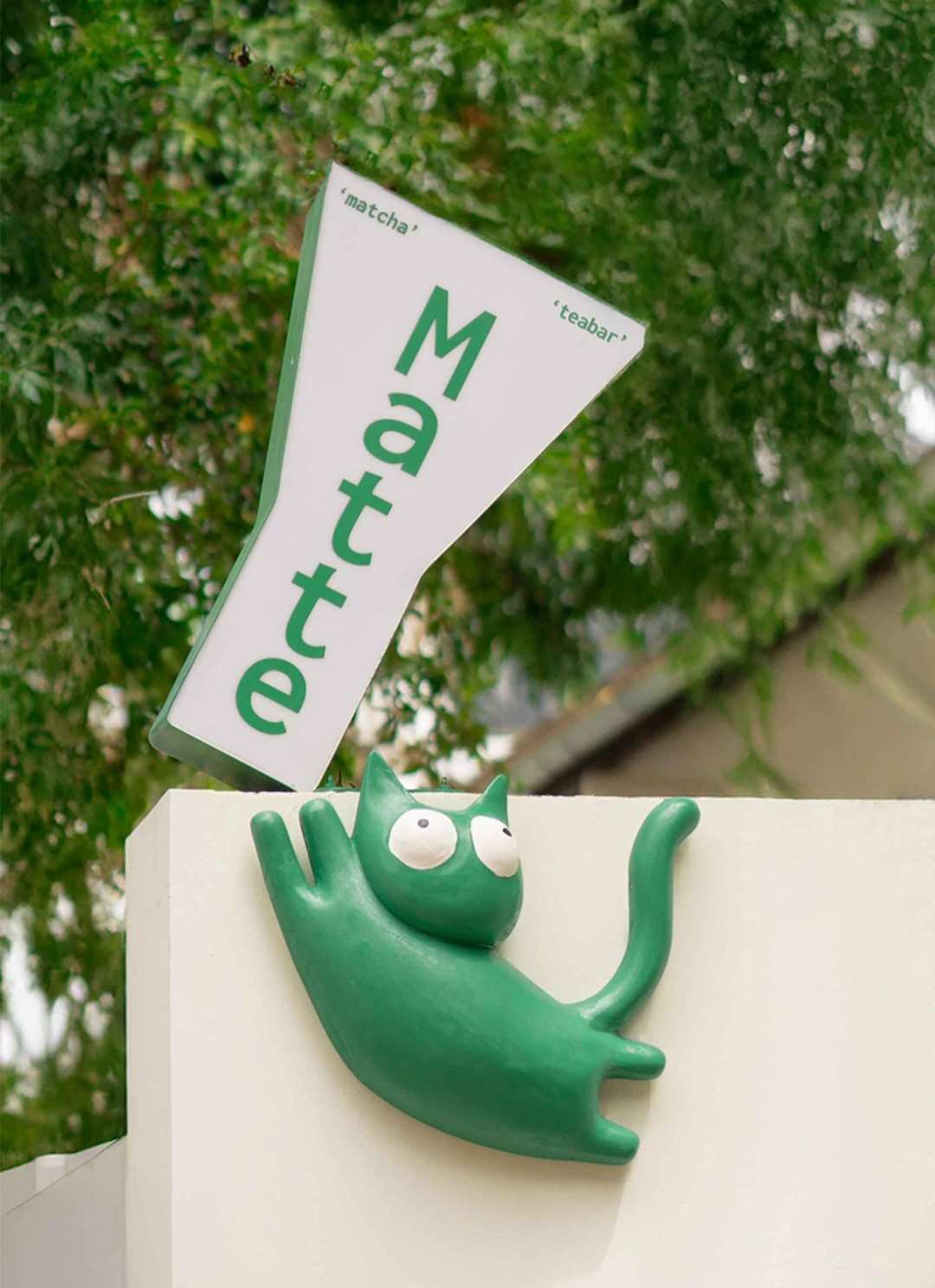 Alih-alih menggunakan papan nama besar atau pencahayaan mencolok, pintu masuk teabar hanya ditandai dengan sebuah papan kecil yang bisa berayun dengan gambar kucing hijau. Elemen ini merujuk pada banyaknya kucing yang sering terlihat di kawasan tersebut, sekaligus membuat teabar ini terasa menyatu secara visual dengan kehidupan sehari-hari di gang tersebut.