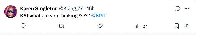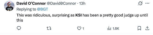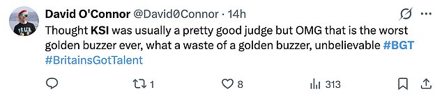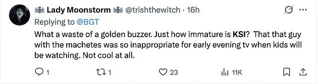 “What a waste of a golden buzzer. Just how immature is KSI? That that guy with the machetes was so inappropriate for early evening tv when kids will be watching. Not cool at all.”