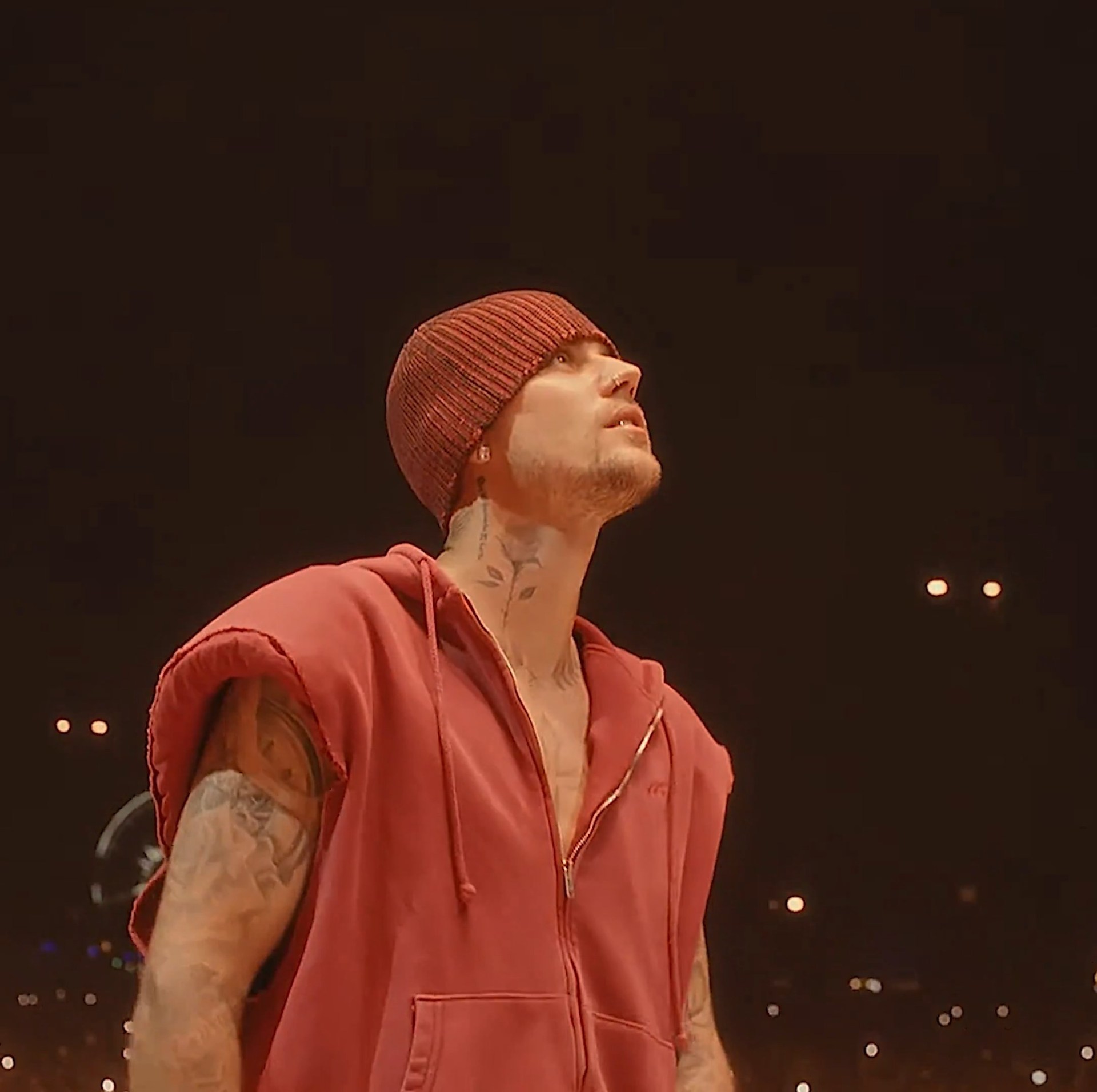 After performing hits like “One Time” and “Baby,” with his younger self providing backing vocals, he played “One Less Lonely Girl.” Midway through, a woman climbed onto the stage and made her way toward Justin, stumbling slightly as she went. The Sorry legend rushed to help her up.