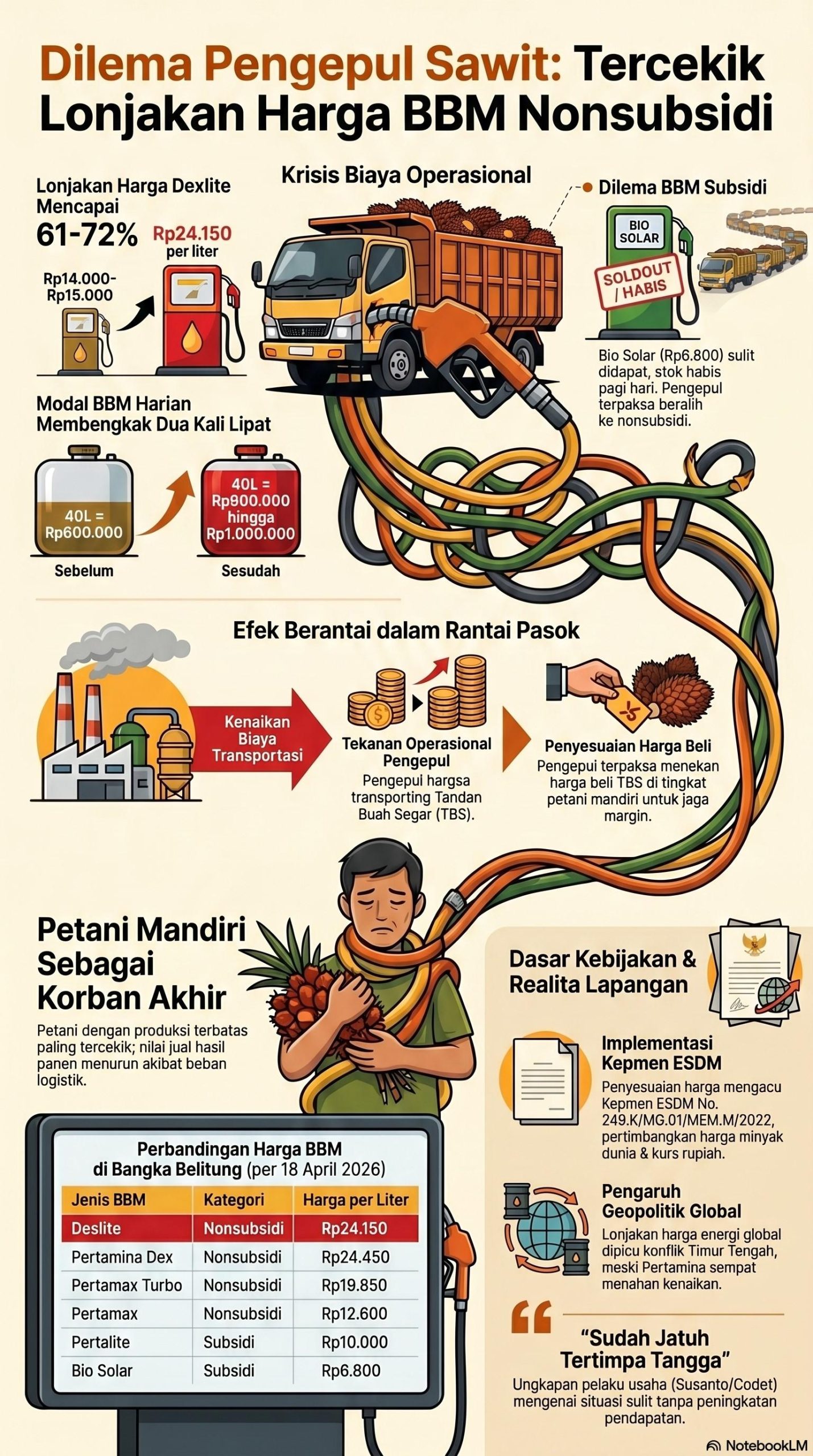Pada hari Sabtu (18/4/2026), telepon ponsel Susanto (35) tiba-tiba berdering. Panggilan tersebut datang dari sopir truk yang sedang mengangkut barang milik Codet, sapaan akrabnya, ke Stasiun Pengisian Bahan Bakar Umum (SPBU). Isi panggilan itu membuat Codet kaget karena sang sopir memberitahu bahwa harga Bahan Bakar Minyak (BBM) nonsubsidi jenis Dexlite mengalami kenaikan mendadak.