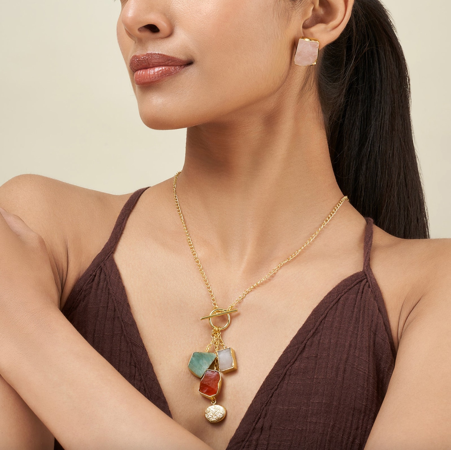 Teejh Zarika Pink, Orange and Turquoise Natural Stone Necklace Set: A desi-designed necklace and earring set, perfect for that shaadi-season flex or a bold Indo-Western look.