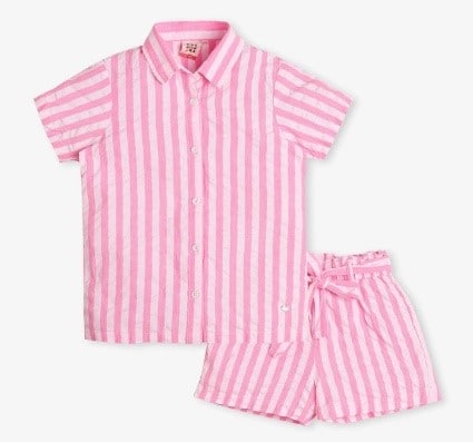 Girls Striped 3-Piece Co-ord Set (Pink): A breathable cotton three-piece co-ord set designed for comfort, layering, and versatile summer styling.