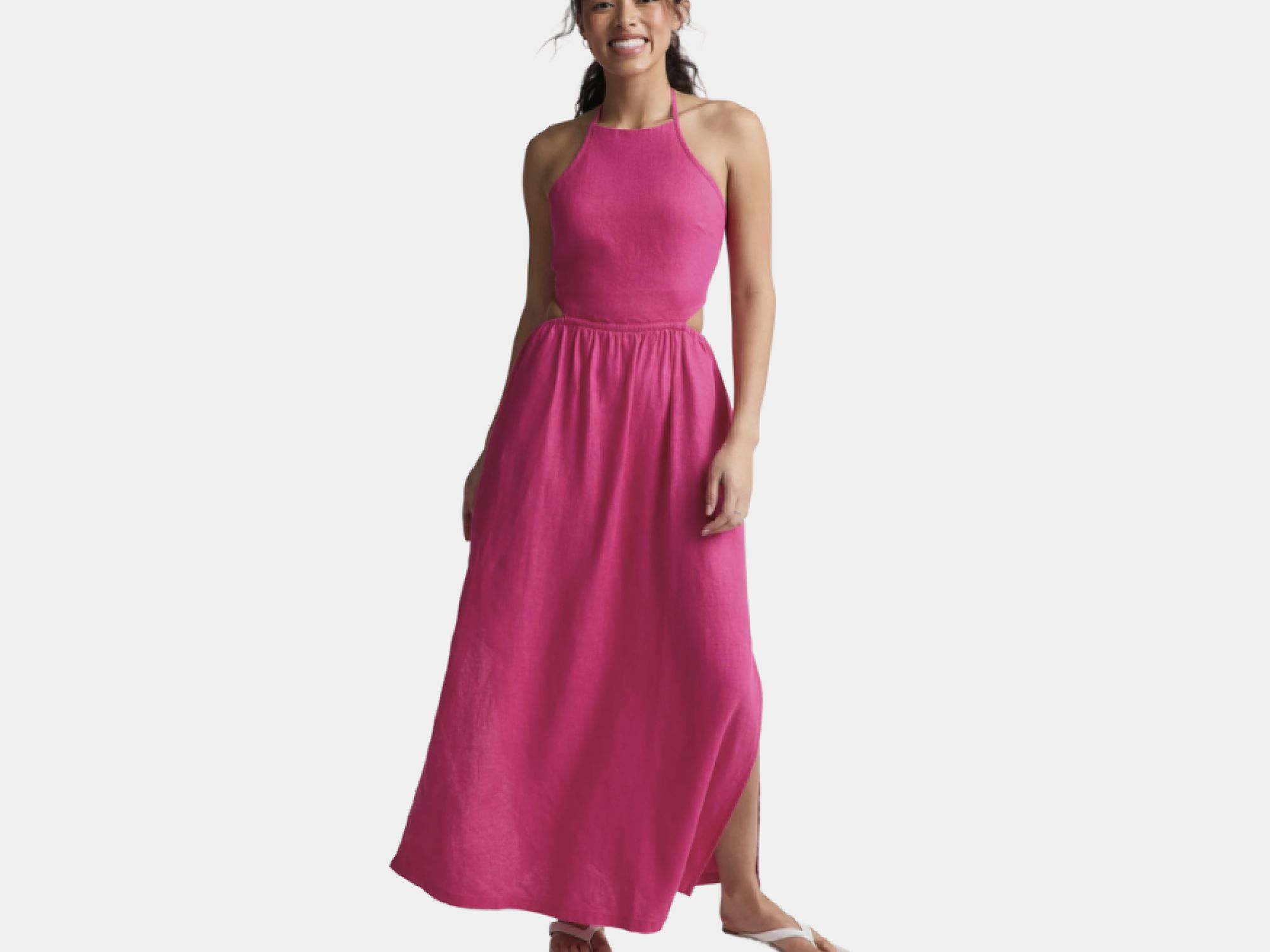 Few fabrics earn their place in a suitcase the way linen does—it handles heat well, dries quickly, and only gets softer with age. The Frank & Eileen Rory linen dress leans into that ease, with a relaxed fit that works just as well for long travel days as it does for wandering the resort. The Beyond Yoga Softwash linen halter dress offers a different take, with a higher neckline, subtle side cutouts, and back smocking that adds stretch through the chest while keeping the fit easy around the waist.