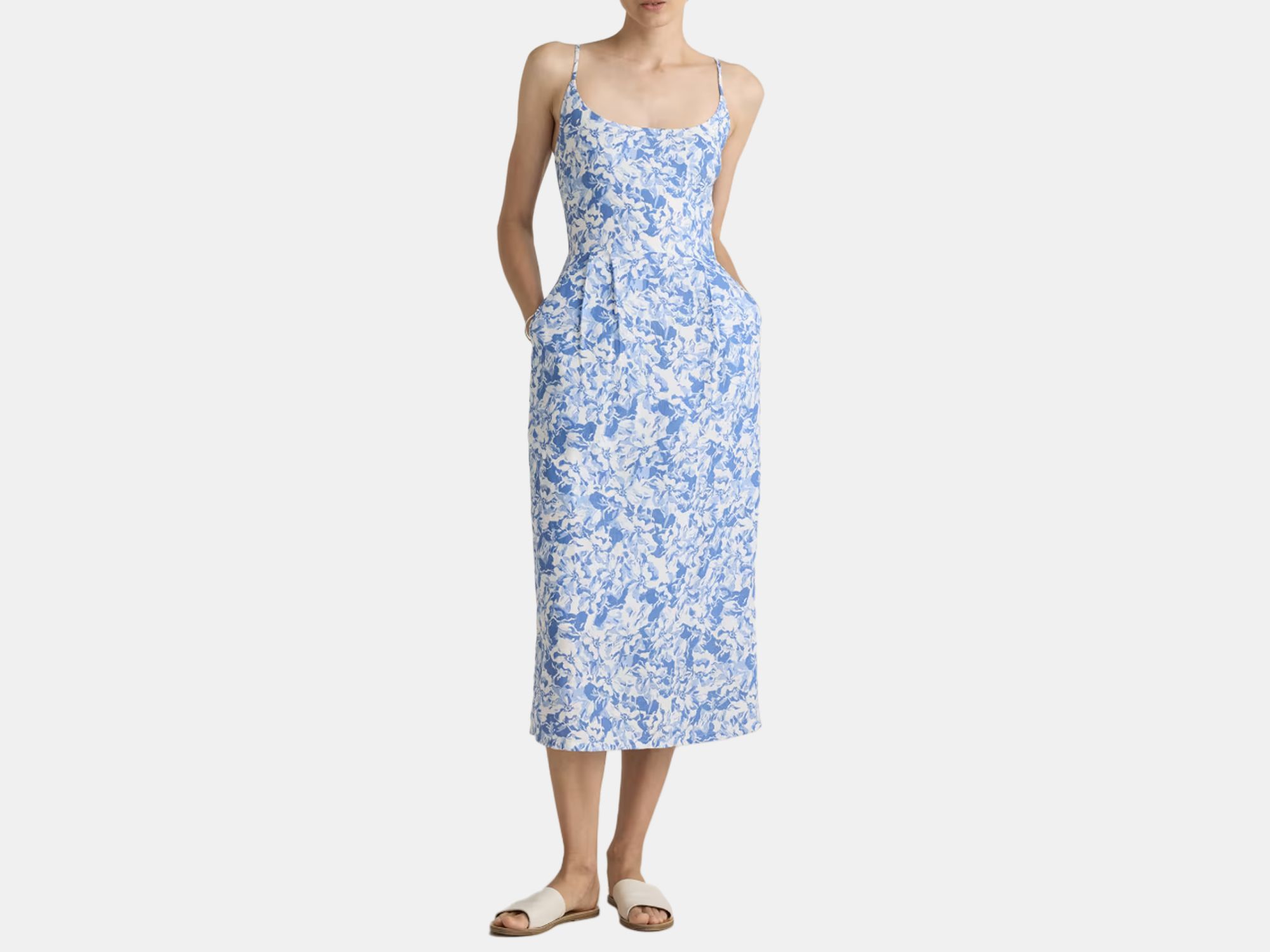 Evening dresses should feel elevated yet easy to wear and pack—something you can throw on for dinner or drinks. The Tahlia dress fits the bill, with a lightweight feel, a relaxed shape, and a subtle neckline cutout and open back that works well on warm nights. Quince’s Washable Stretch Silk midi dress is especially ideal for travel—it’s machine washable, wrinkle-resistant, and packs down easily, with a cowl neckline and open racerback that gives it a softer, more formal look and feel.