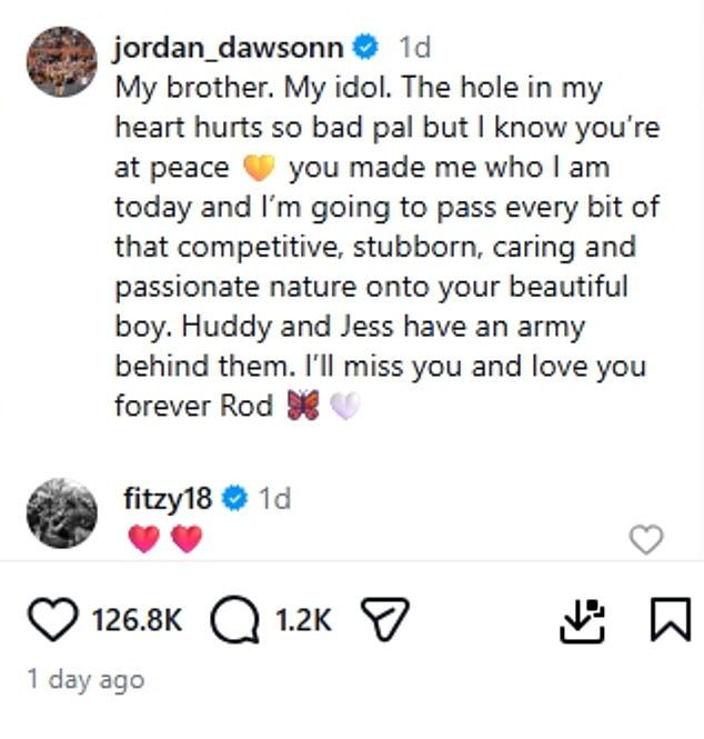“My brother. My idol. The hole in my heart hurts so bad pal but I know you’re at peace. You made me who I am today, and I’m going to pass every bit of that competitive, stubborn, caring, and passionate nature onto your beautiful boy,” Dawson wrote. His message also extended support to Jaryd’s partner, Jessica, and their young son, Hudson, emphasizing that the family will not be alone during this difficult time.