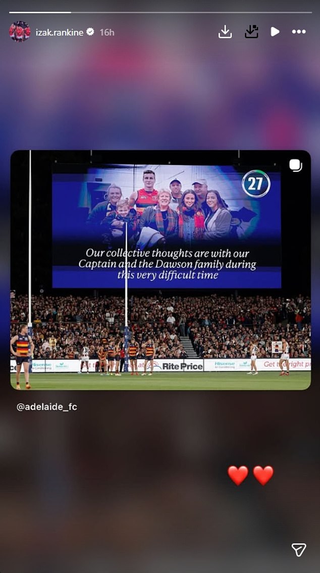 Dawson did not play in Adelaide’s Round 6 clash against St Kilda, instead choosing to attend the match at Adelaide Oval from the stands alongside his wife. He was seen in the rooms with teammates before the game as the club prepared for the fixture. A tribute was held during the match, with the crowd rising in the 12th minute of the first quarter, honoring Dawson’s No. 12 guernsey. A message displayed at the ground read: “Our collective thoughts are with our captain and the Dawson family during this very difficult time.”
