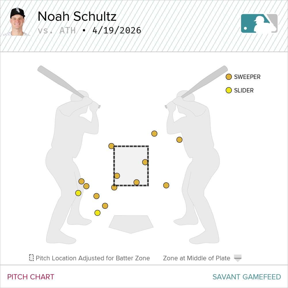 Despite these challenges, Schultz showed great control over other aspects of his game. His changeup drew six swings from right-handed hitters, three of which resulted in strikeouts. Overall, 30% of the swings against Schultz came up in the air during his five innings of work, contributing to just one run allowed.