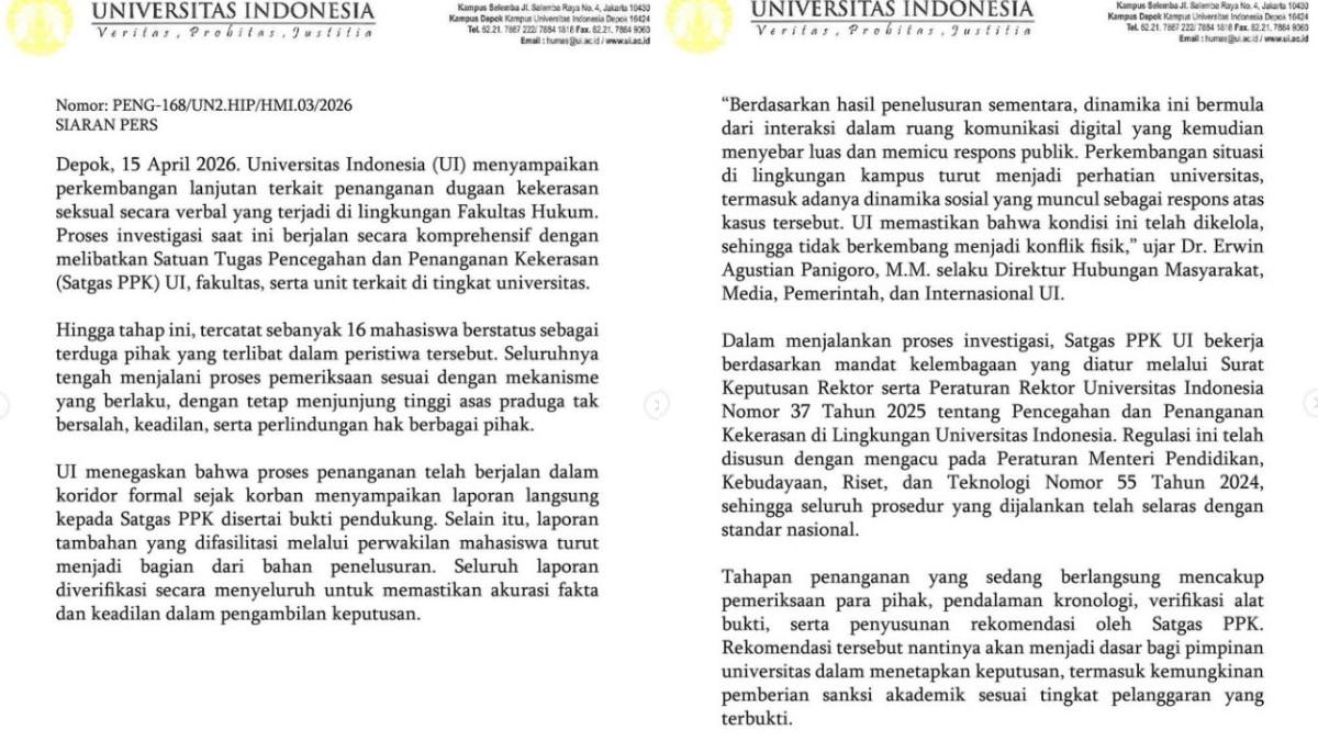 Di sisi lain, pihak UI melalui siaran pers pada Rabu, 15 April 2025, menyatakan bahwa kasus dugaan Kekerasan Seksual (KS) verbal ini tengah ditangani oleh Satgas Pencegahan dan Penanganan Kekerasan (PPK). Dalam prosesnya, sebanyak 16 mahasiswa FHUI dinonaktifkan mulai 16 April hingga 30 Mei 2026. Selama masa skors, para mahasiswa tersebut tidak diperbolehkan mengikuti kegiatan akademik maupun berada di lingkungan kampus.