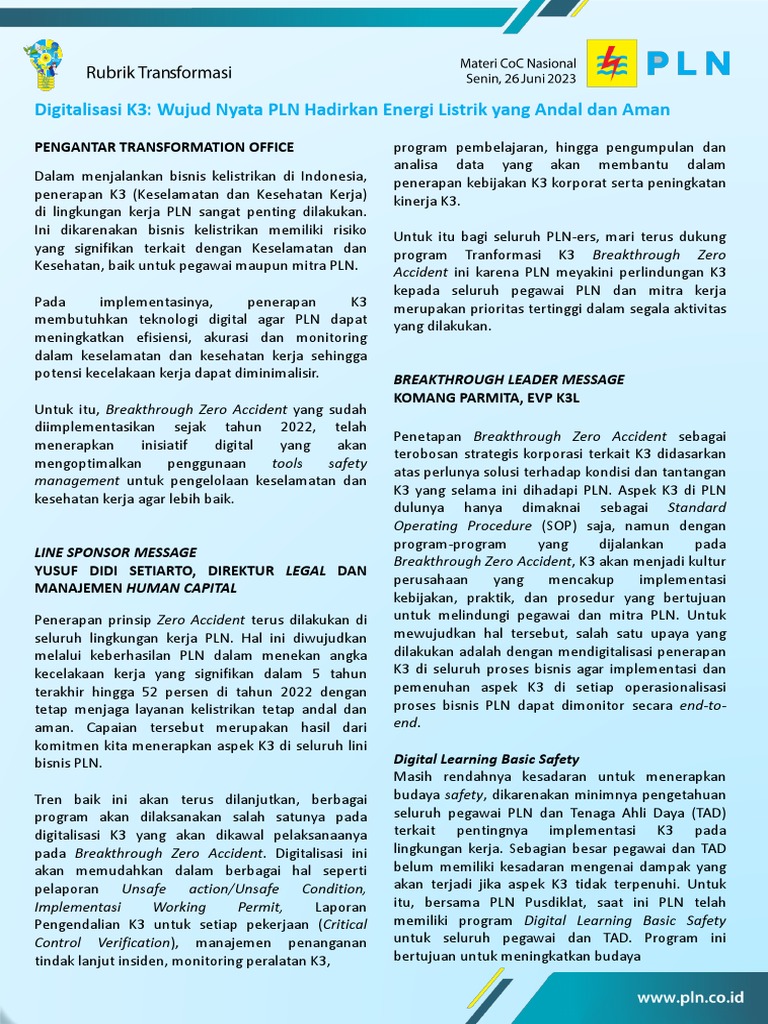 Manajemen PLN menilai disiplin dalam penerapan K3 sebagai investasi jangka panjang. Lingkungan kerja yang aman terbukti meningkatkan produktivitas, menjaga keandalan sistem, serta memastikan pelayanan kepada pelanggan tetap optimal. Dengan komitmen tersebut, PLN tidak hanya menghadirkan listrik sebagai sumber energi, tetapi juga memastikan setiap terang yang menyala berasal dari proses kerja yang aman, profesional, dan penuh tanggung jawab demi mendukung keselamatan masyarakat dan kemajuan Indonesia.