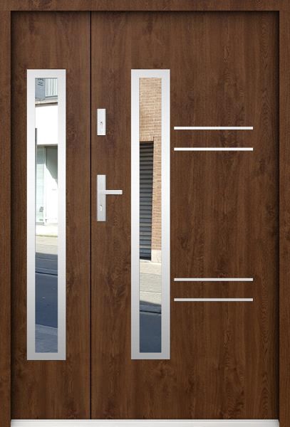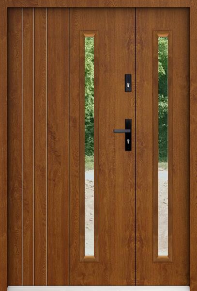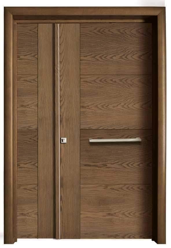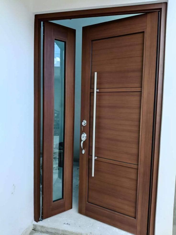 Material kayu selalu menjadi pilihan aman untuk menciptakan kesan hangat dan natural. Pada model ini, pintu besar biasanya digunakan sebagai akses utama, sementara pintu kecil cukup untuk aktivitas sehari-hari. Finishing natural dengan serat kayu yang terlihat membuat tampilan lebih hidup dan tidak membosankan. Cocok untuk rumah minimalis, tropis, hingga Japandi.