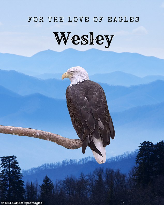 Wesley, a female bald eagle, has a black leg band and is recognized by a chronic shoulder injury, which causes her wings to sit unevenly. Due to her limited flight ability, it is very likely that Wesley is still in the immediate vicinity of Dollywood.