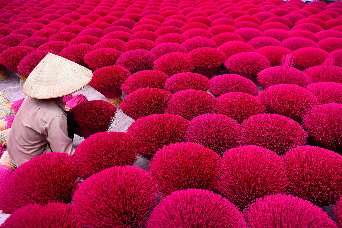 A woman collecting incense sticks in a courtyard in Quang Phu Cau Village in Hanoi. Photo by VnExpress/Giang Huy