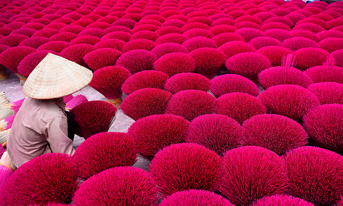 Hanoi’s vibrant character is evident in its colorful scenes, such as the bright pink incense sticks found in the Quang Phu Cau incense village. Another iconic feature is the striking red Huc Bridge that spans Hoan Kiem Lake, adding a vivid touch to the city’s skyline.