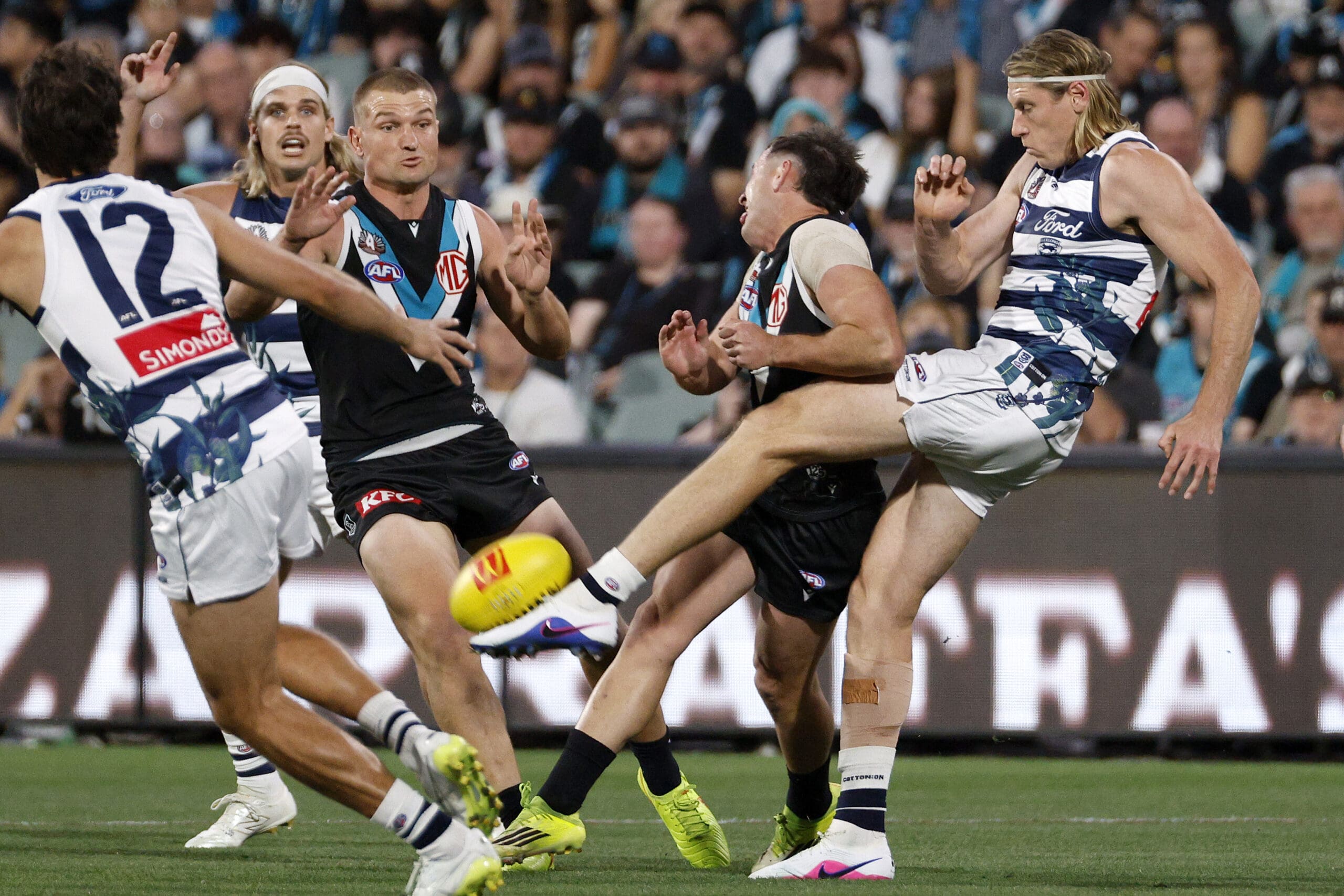 Geelong is facing a tense wait as they await the results of scans for Mark Blicavs, a crucial player for the team. The injury occurred during the first quarter of Saturday night’s match against the Power, where Blicavs suffered an accidental collision with Zak Butters. The incident happened when Butters, known as the Power’s “wrecking ball,” made contact with Blicavs mid-kick.